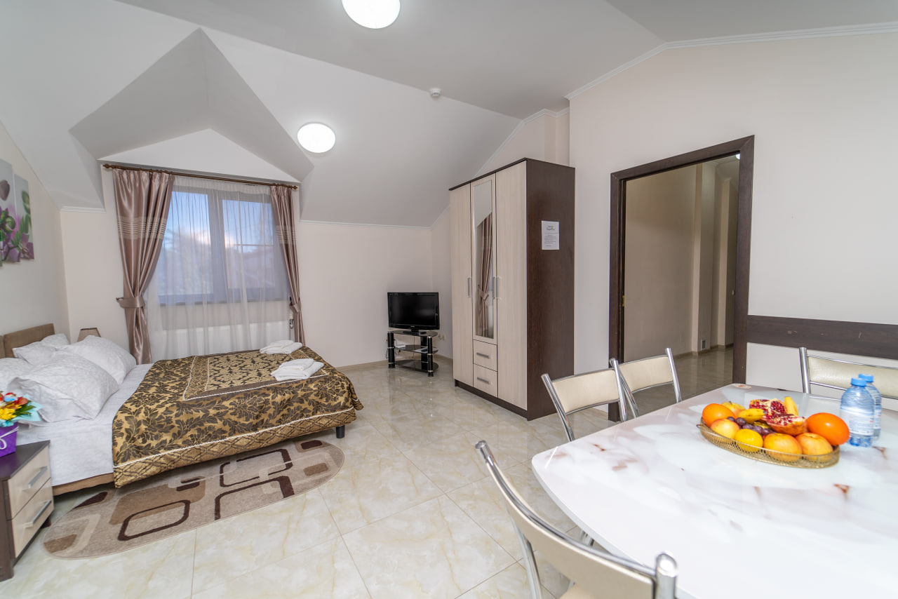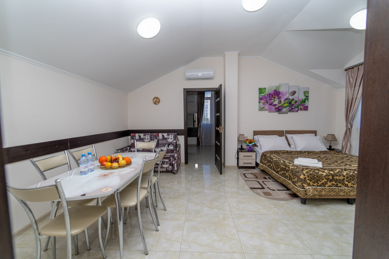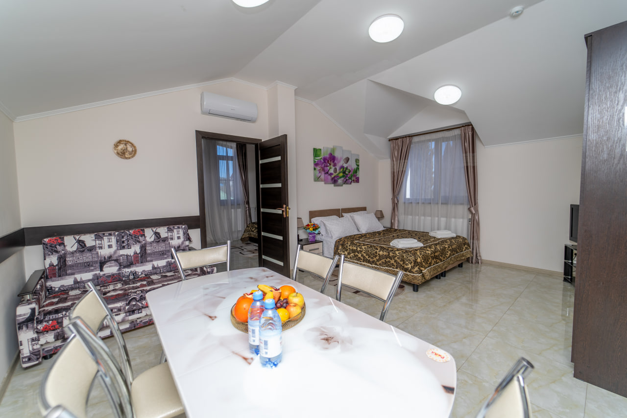 Площадь номера - 40 кв.м. 3 осн. места. 1 доп. место. Кухня. Мебель: вешалка, диван раскладной, зеркало, кресло-кровать, кровати односпальные /одна двуспальная кровать, прикроватные тумбочки, стол, стулья, шкаф. Оборудование: микроволновая печь, набор посуды, телевизор, утюг, холодильник, чайник. Санузел: с душем, туалетные принадлежности, фен. Сервис: Wi-Fi бесплатно, смена полотенец, смена постельного белья, уборка номера.