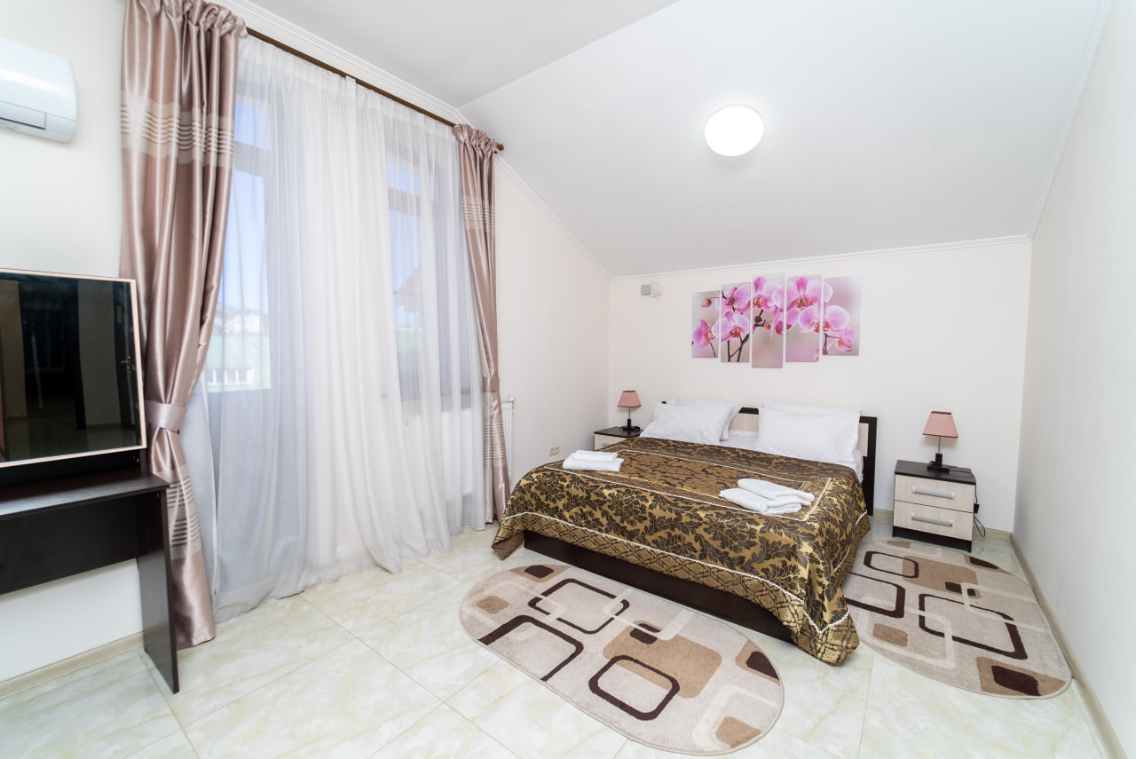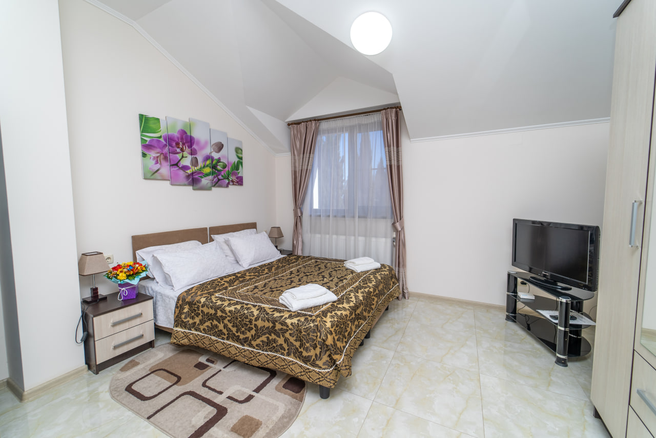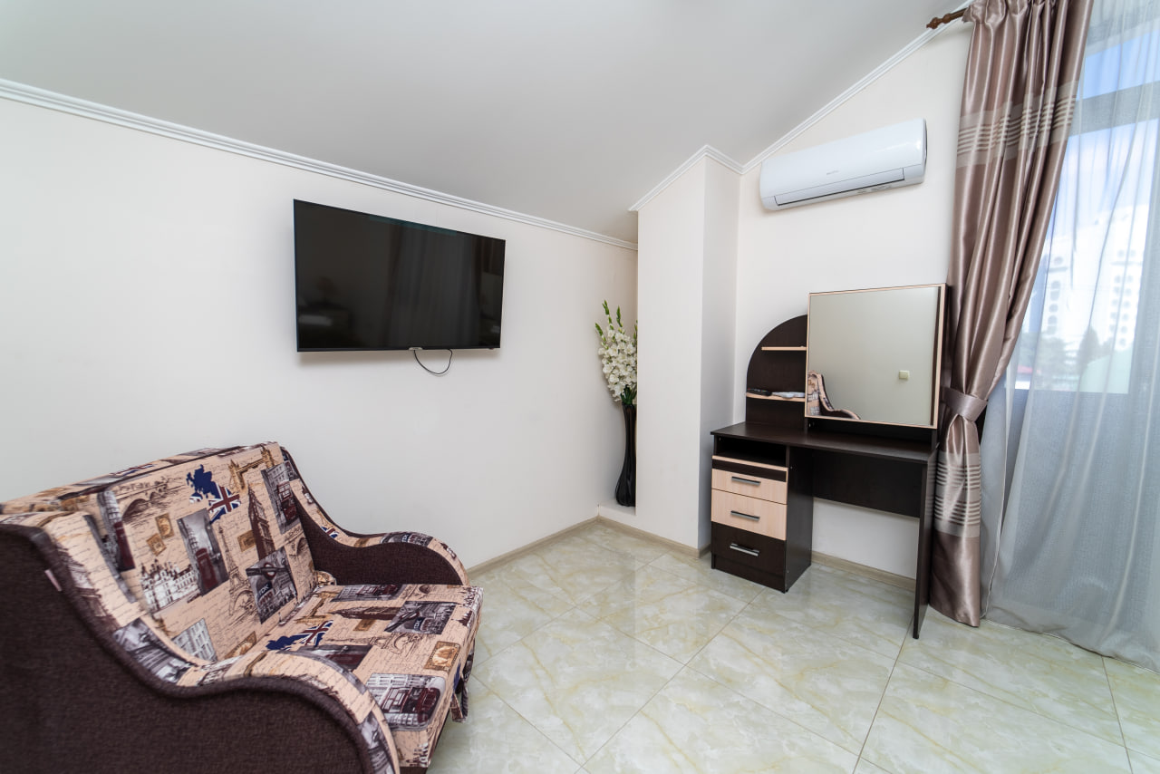 Площадь номера - 40 кв.м. 3 осн. места. 1 доп. место. Кухня. Мебель: вешалка, диван раскладной, зеркало, кресло-кровать, кровати односпальные /одна двуспальная кровать, прикроватные тумбочки, стол, стулья, шкаф. Оборудование: микроволновая печь, набор посуды, телевизор, утюг, холодильник, чайник. Санузел: с душем, туалетные принадлежности, фен. Сервис: Wi-Fi бесплатно, смена полотенец, смена постельного белья, уборка номера.