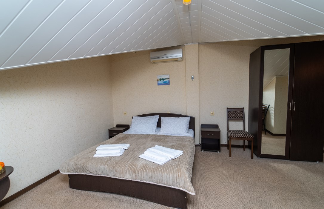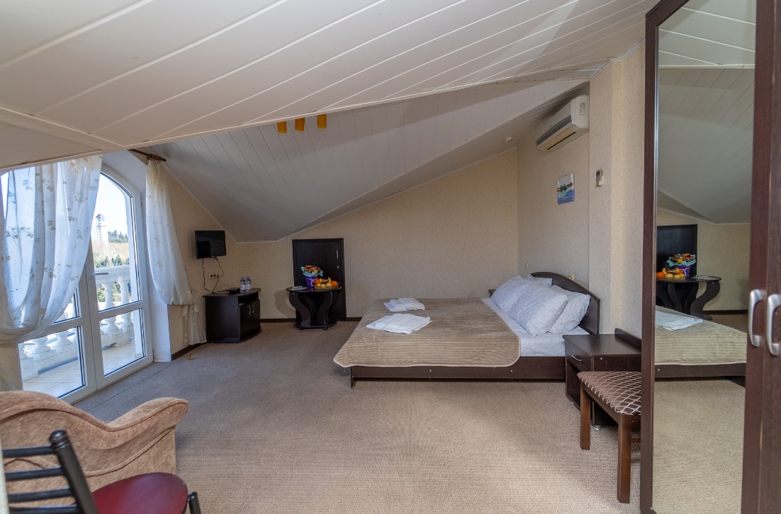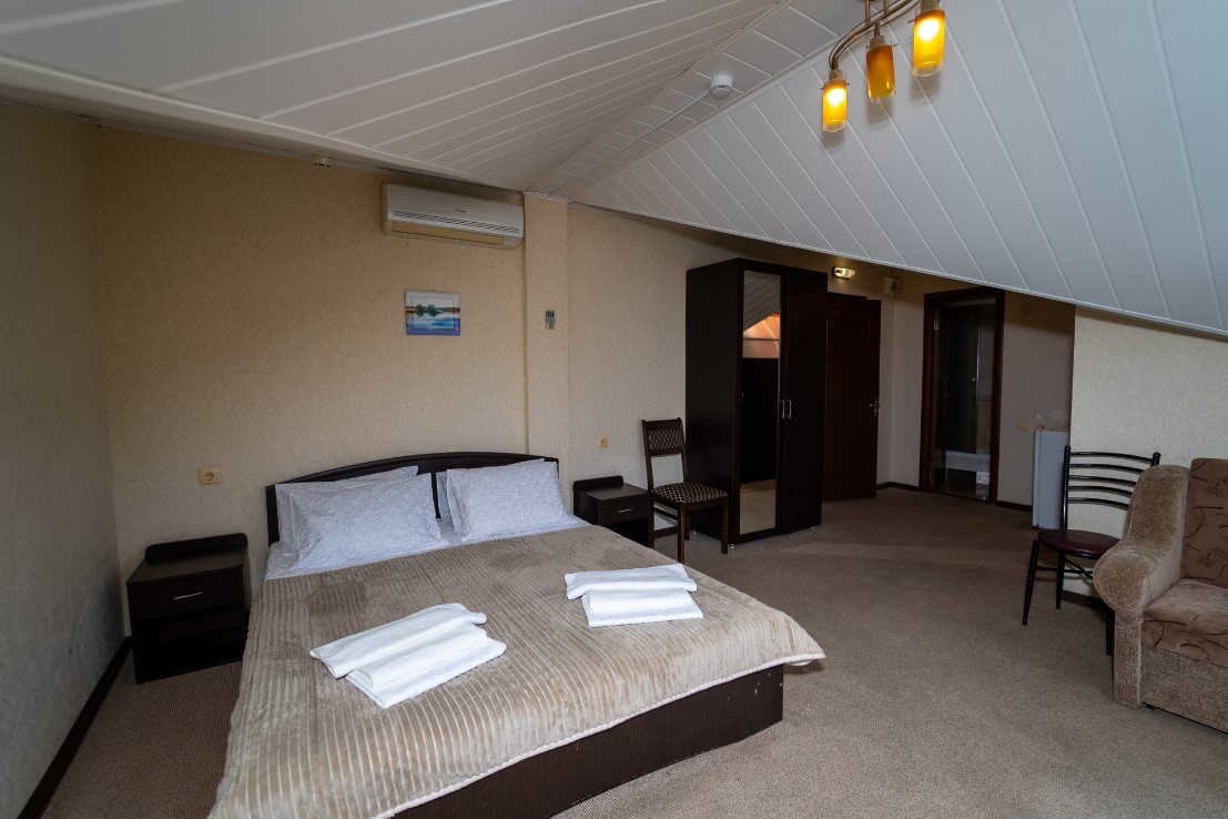 Площадь номера - от 35 до 50 кв.м. 3 осн. места. 1 доп. место. Балкон. Мебель: вешалка, зеркало, кровать двуспальная, прикроватные тумбочки, стол, стулья, шкаф. Оборудование: кондиционер, телевизор, холодильник, чайник. Санузел: с душевой кабиной, туалетные принадлежности, фен. Сервис: Wi-Fi бесплатно, смена полотенец, смена постельного белья, уборка номера.